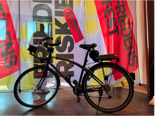 The press launch of the 375th Friedensfest (Peace festival) in Annahof, Augsburg. Excellent to be able to arrive with one of our newly donated Bike Kitchen bikes, already pimped up for bicrophonic activity, as well as meet some of the other artists making for the Festival. 8.05-8.08.25. INFO.